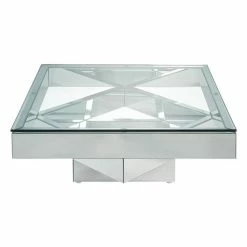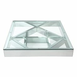 Bring contemporary elegance to your living room with the Meria 3-tier coffee table featuring a glass top with a fully mirrored apron and pedestal base. The square coffee table features a unique geometrical design that make it a conversational piece and adds a touch of modern design to any living room area.