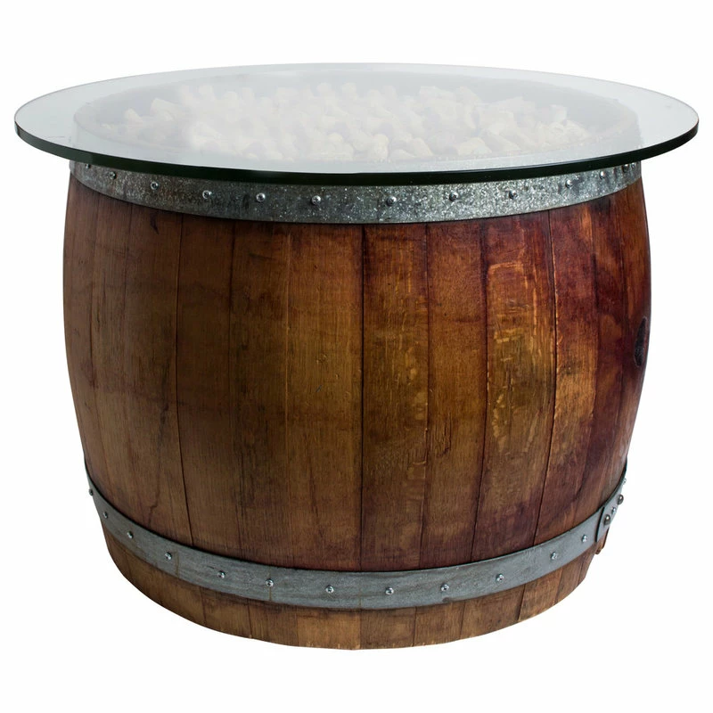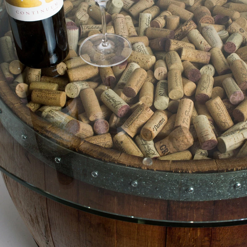 Artistry and practicality align in the new life of a recycled Napa Valley wine barrel. The artisans took great care to preserve and enhance the natural beauty of the solid oak barrel while crafting it into a coffee table, featuring a glass top and a beautiful collection of corks. Finished with 3 coats of durable furniture lacquer for a lifetime of use. Please note, because every barrel is different, the coloring on each piece will vary slightly from the one in the photo. Approximate size: 20.5″ tall by 27″ round at the peak. Glass is 30″ in diameter. Please allow 1-2 weeks for delivery.
