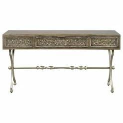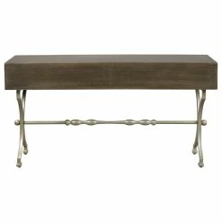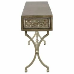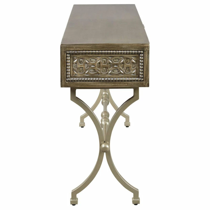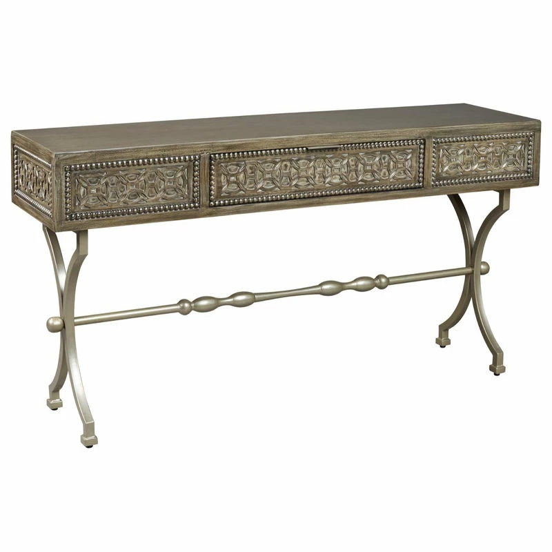 The Quinnland console sofa table is style with a purpose. This casual look flaunts a medallion pattern along the front. Champagne color finished metal complements the antiqued gray finished wood. Show off decor on top. Rest assured X-base is as strong as it looks. Functional drawer allows you to keep knick knacks out of sight.