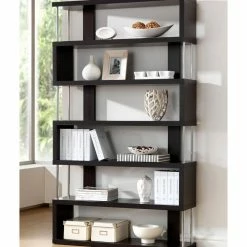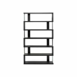 This artsy, modern bookcase gets you organized with style. Our Barnes Bookcase is made of white paper veneer over an engineered wood frame and features chromed steel side supports. Not only does this modern display shelf house books, but it is also the perfect place to show off your prized vases, decor, and home accents. The Barnes Bookcase is Malaysian-made, requires assembly, and should be dusted with a dry cloth. Separately offered is the Barnes Bookcase with three shelves as well as the Barnes Bookcase in dark brown.