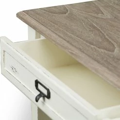 Boasting a white-streaked and distressed finish plus plenty of storage space via two drawers and two shelves, our Dauphine Traditional French Accent Console Table unifies fashion and functionality. The genuine mindi-wood top features a white-streaked natural veneer that pairs perfectly with the distressed white finishing that comprises the remainder of this console table. Black metal drawer handles offer attractive contrast. Superb value in a discount-furniture item.