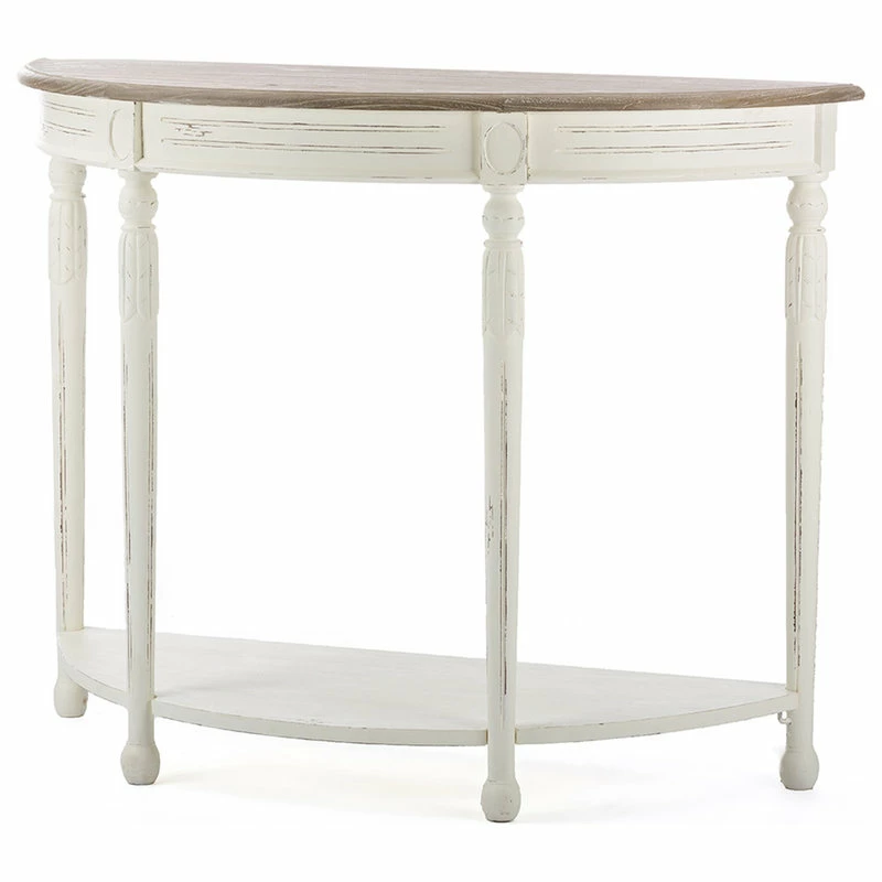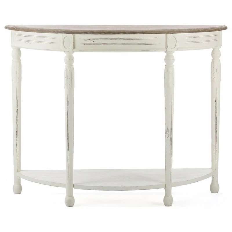 Combining European stylistic elements with genuine Southeast Asian wooden construction, the Vologne Wood Traditional French Console Table straddles the continents. This console table sports a genuine bayur wood semi-oval top and a distressed, antiqued finish complete with authentic white streaking. Distinctive styling at a discount price.
