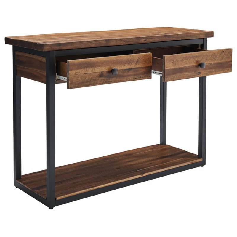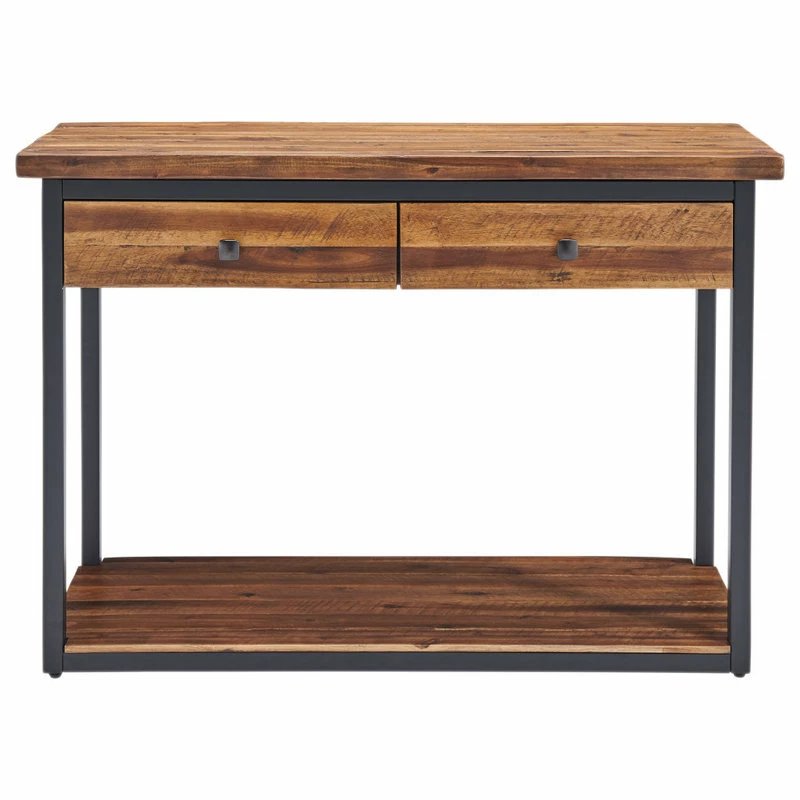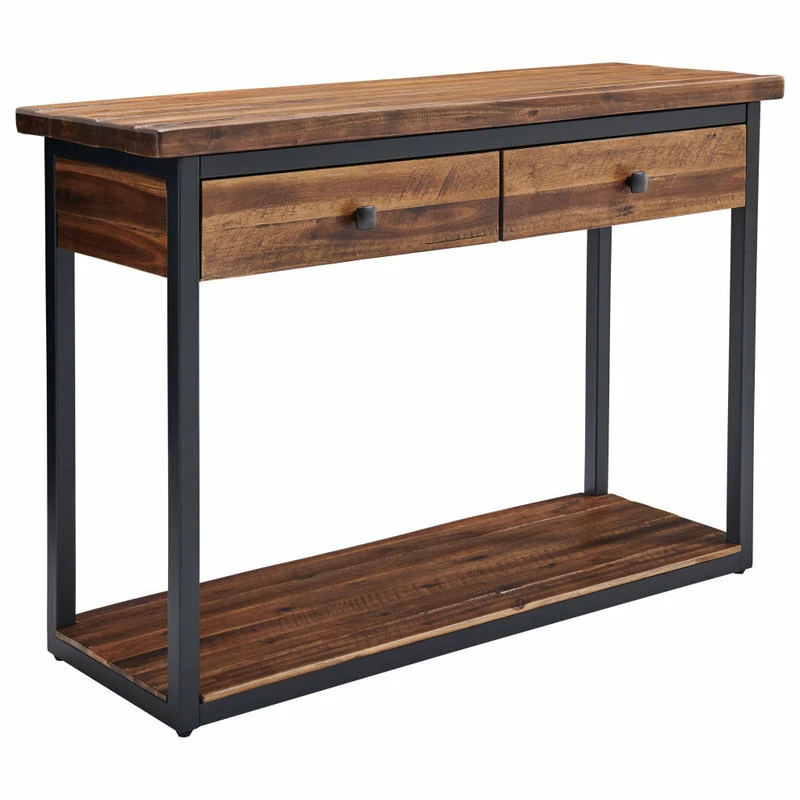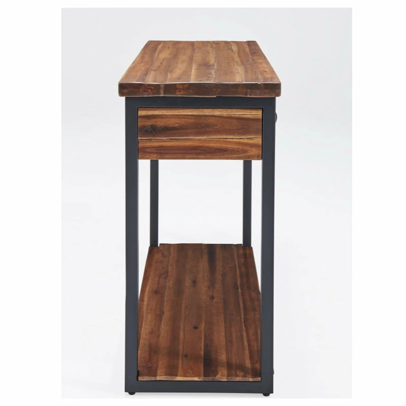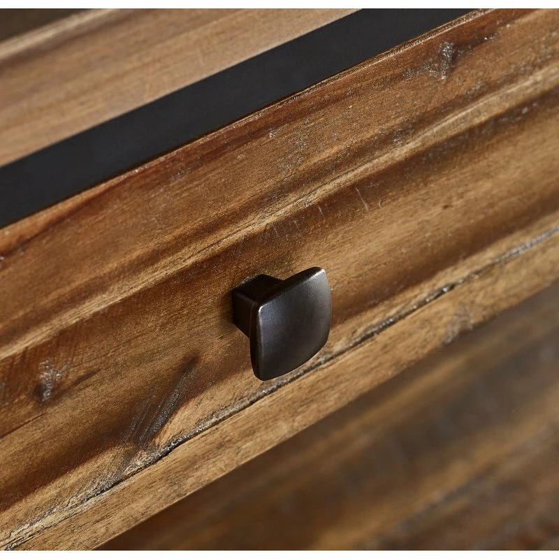 This collection of rustic wood and metal provides unpolished elegance to your space. With functional drawers and a low shelf each piece is uniquely yours. Knots, cracks and even rough-hewn edges showcase the wood’s original qualities. Our lacquer finish with light and dark tones allows for the wood’s natural grain to show through. This collection will make a statement in your living space.