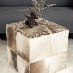 Sit back and relax with your feet rested on this comfortable stool. The perfect combination of form and function with a stylish design. Cube leather accent stool will complement upholstered velvet sofa with light colored pillows for a luxurious appeal. This item ships in 1 carton. Due to the handmade nature of this item, no two will be alike, there will be slight differences in shape, size, and color. Suitable for indoor use only. Leather and hair on hide are natural products, and therefore no two will be alike. There may slight variations in pattern, natural blemishes, colors, and overall aesthetic of the product. Maximum weight limit is 200 lbs. Made in India. This is a single stool. Contemporary style.