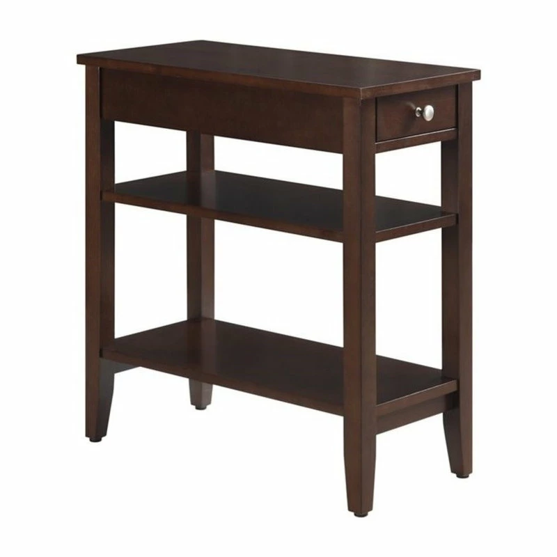 The American Heritage Three-Tier End Table is the perfect complement to any home. Featuring a drawer for hidden storage, you can hide away unsightly controls and accessories. Also featuring a middle and bottom shelf, you will have plenty of space to display collectibles or store magazines. The rich Espresso wood finish will complete the look. Made of wood, this table is also built to last.