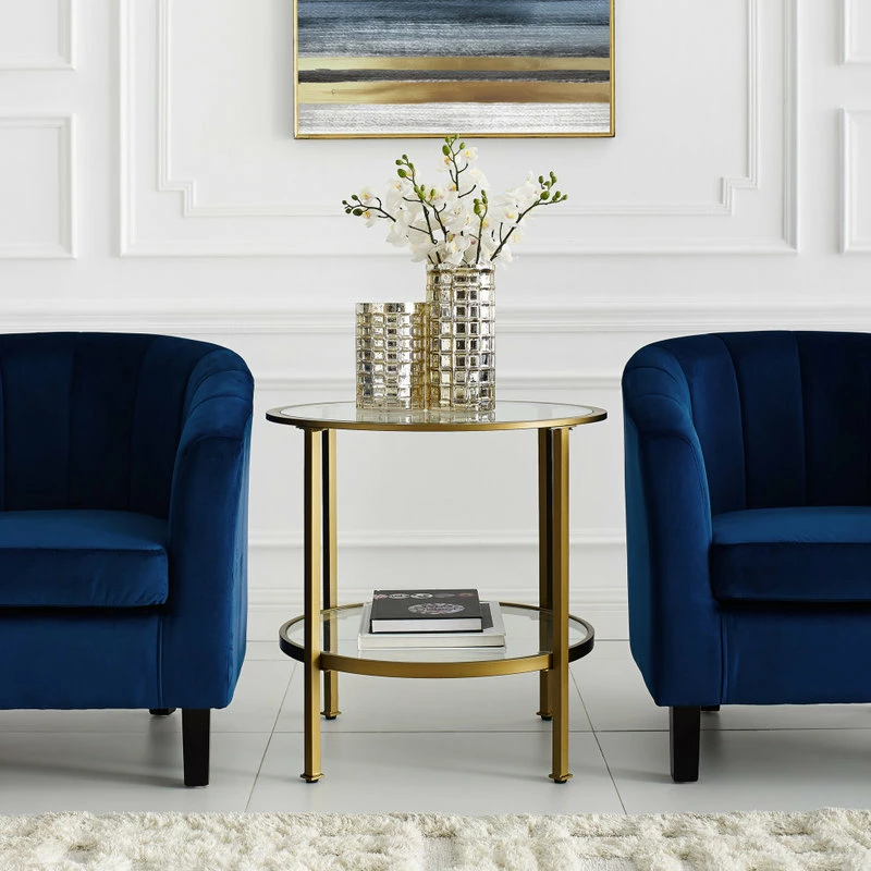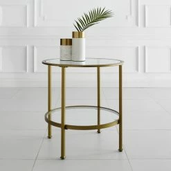 Showcase your refined style, with the eye-catching Aimee side table. This table features an openwork steel frame, warmed with a power-coated polish gold finish and a touch of antiquing. This side table is stylish enough to stand on its own, or it can be easily paired with the rest of the Aimee Collection.