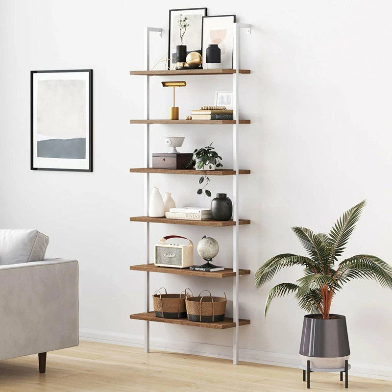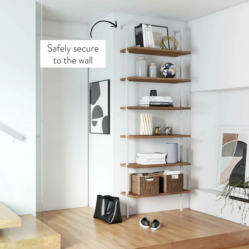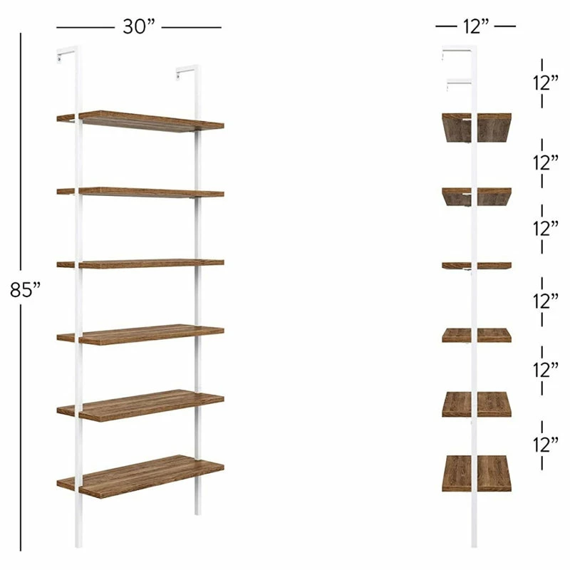 - This 6-tier tall, modern wall mount bookcase or shelving dresses up any space with its industrial style of wood and metal.