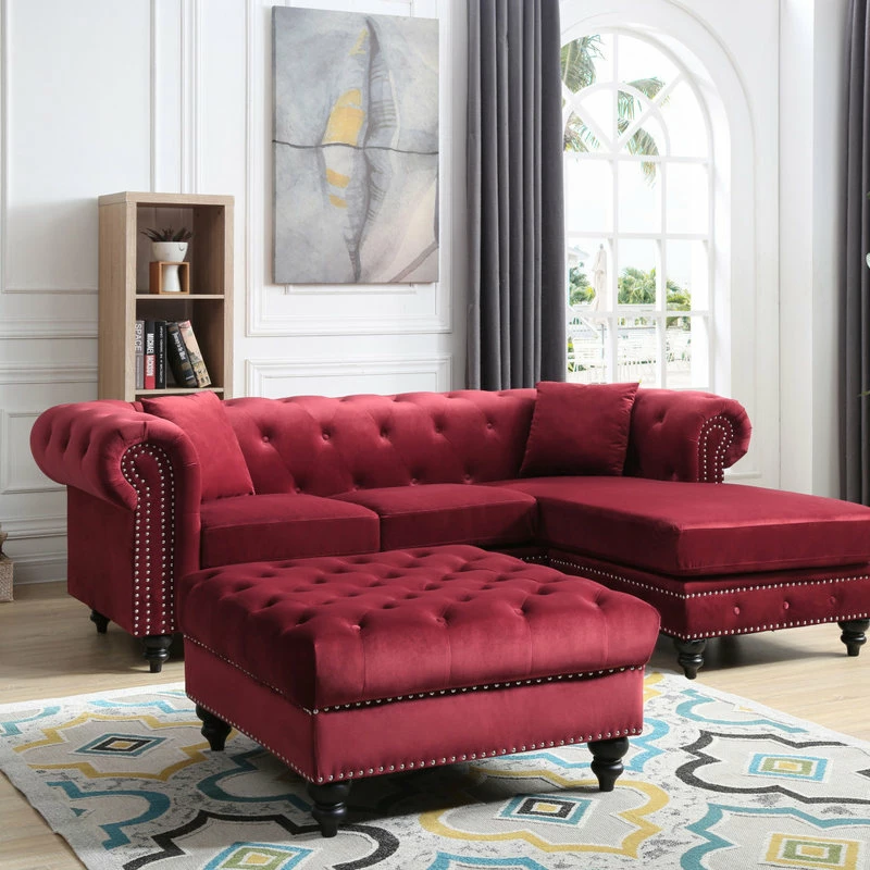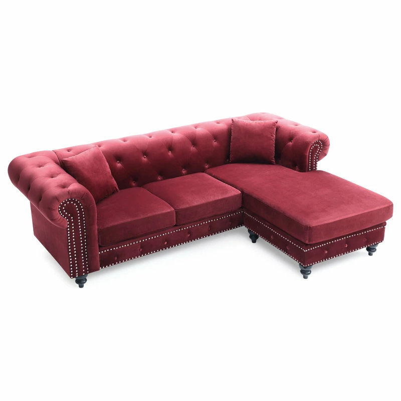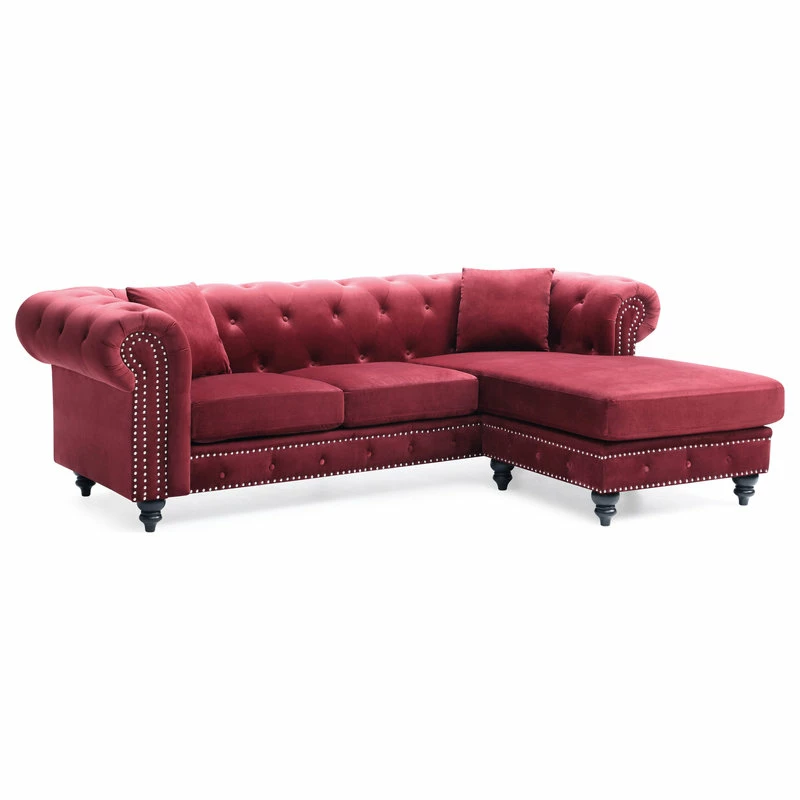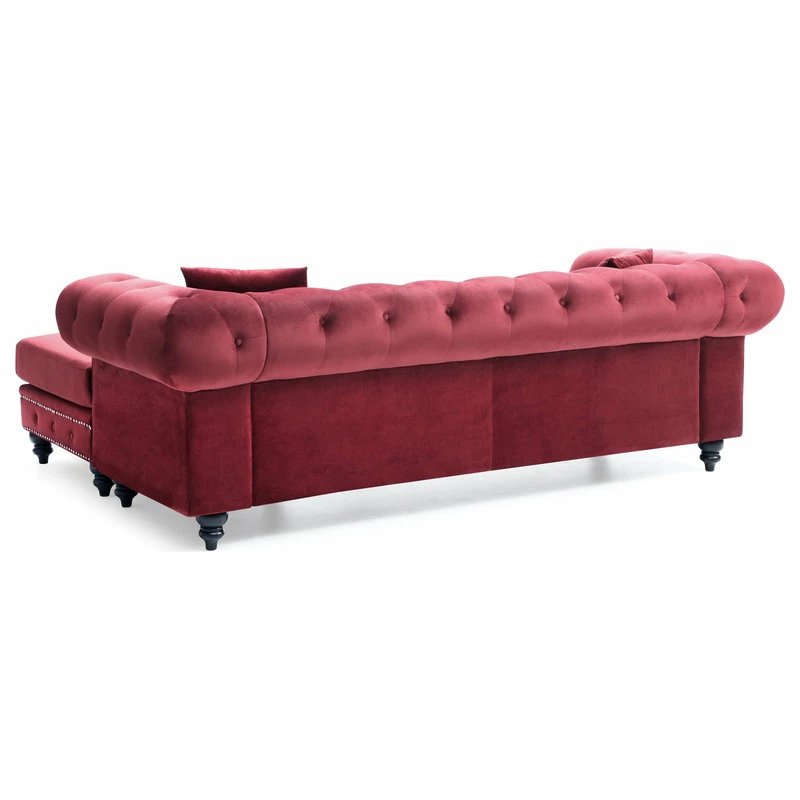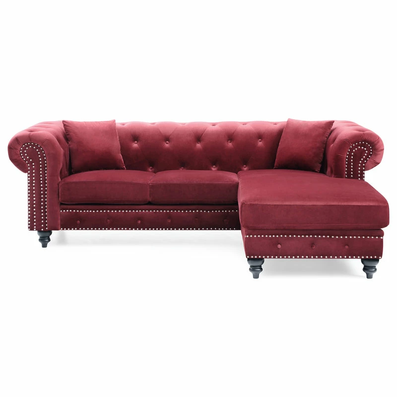 Dramatic Chesterfield Sectional features Soft Velvet Cover Tufted On Front and back as well as Bottom Rail. Chrome Nail-heads and Wood Legs are also included. Pocketed Coil Seating provides a medium Firm feel with long lasting durability. Two Matching Throw Pillows are also included. Available in a choice of colors as well as a Matching Ottoman can be purchased separate.
