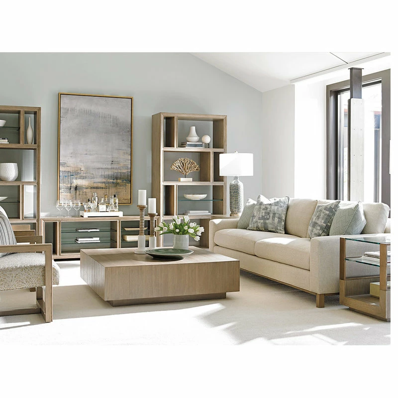 The 48-inch square cocktail table makes an impactful design statement and offers the scale to accommodate a pair of flanking sofas or a sofa with a pairing of chairs. The top surface elegantly showcases the soft lines of the Gray Elm veneer.