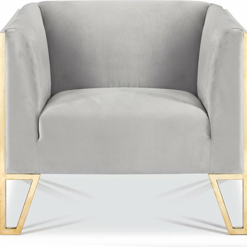 Tuxedo style accent chair perfect for making statements. Grey velvet throughout the body and through the sides of the sofa. A very regal look with a touch of modernity with the steel frame throughout the edges and legs of the model.