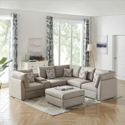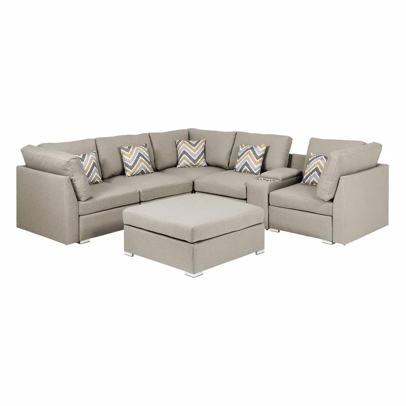 Comfort, Style, and Quality! These are the important features for the Amira Collection. This beautiful modular sofa sectional couch with USB console with cupholders, ottoman, and five matching accent pillows will fit into any living room and impress your guests! The comfortable beige linen fabric with matching accent pillows will light up your living room with the most trendiest of looks. Perfect for apartments, condo, loft, and single family home, you will be able to welcome multiple guests comfortably where everyone is able to enjoy entertainment together.