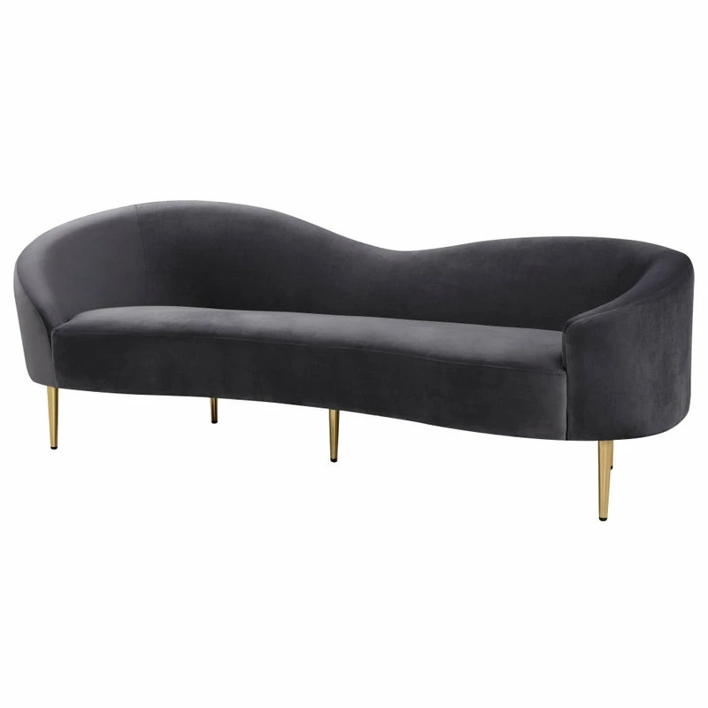 Get comfy while remaining chic in this elegant Ritz grey velvet sofa. Plush grey-colored upholstery provides a soft texture that is pleasing to the senses, while its curved design offers a contemporary touch to your home furnishing. Gold metal legs complement the sofa’s sophisticated grey color, creating a gallant piece anyone would be proud to display in their home.