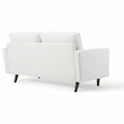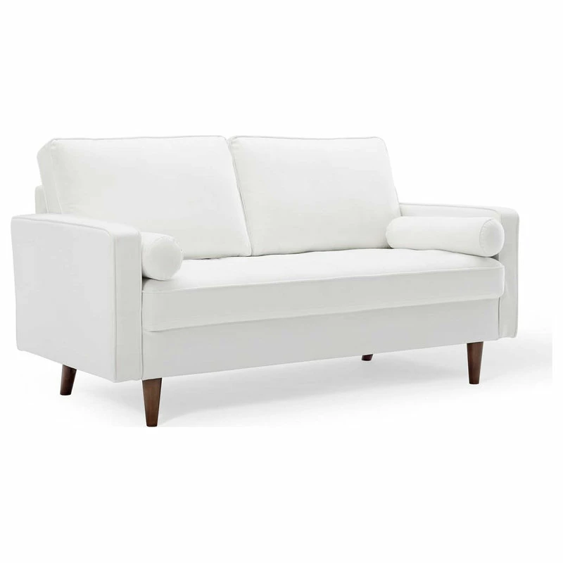 Update your home or apartment with the mid-century style and modern-day convenience of Valour. This comfortable living room loveseat features a tailored profile with elegant biscuit tufting and two bolster pillows. Covered in soft, stain-resistant performance velvet upholstery, Valour has dense foam padding, individually wrapped innerspring pocket coils, and sinuous spring support for a comprehensive seating experience. This luxe modern two-seater sofa comes with walnut-stained wood legs with non-marking foot caps and supports up to 600 lbs. Say goodbye to the days of hauling heavy furniture. This tufted loveseat ships in a portable box for easy maneuvering.
