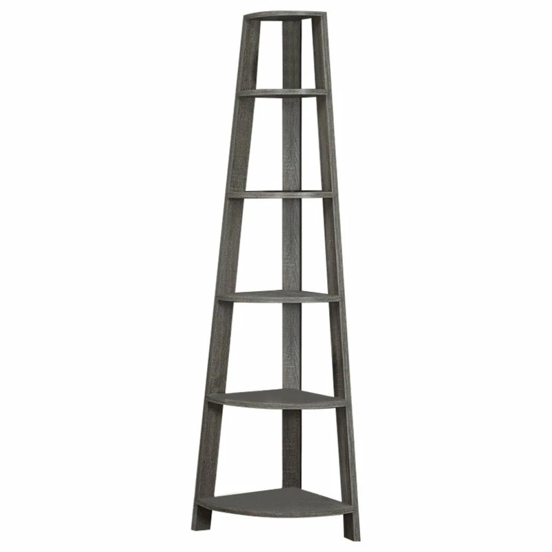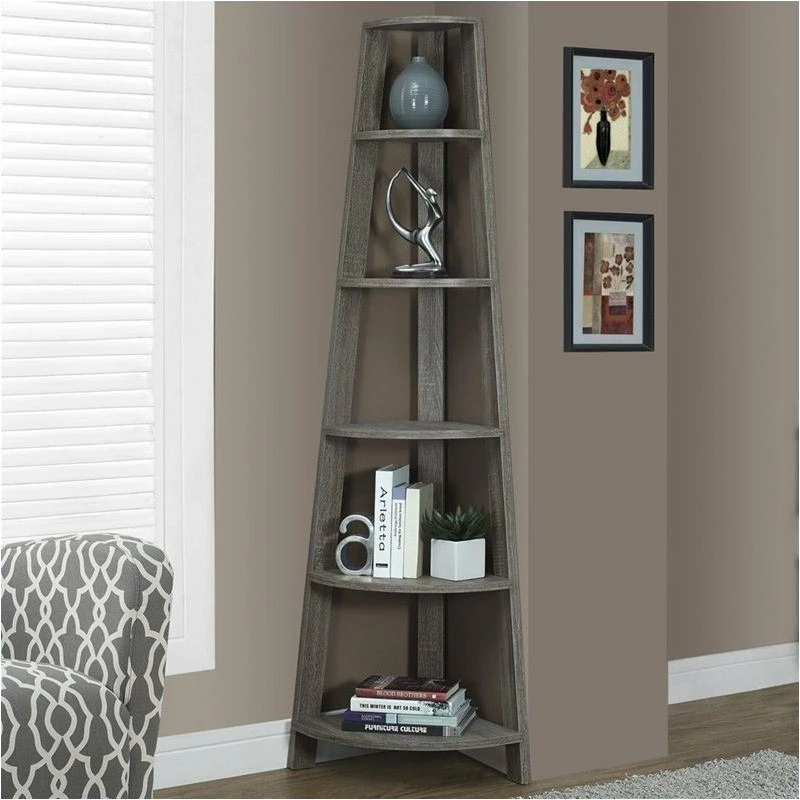 Add the perfect corner piece to any room with this 72″ high dark taupe, reclaimed, wood-look accent etagere complete with five tray style shelves. This contemporary piece adds additional display space as well as compliments any dΓ©cor in your home. Use it as a seasonal or holiday piece with it’s unique peak design.