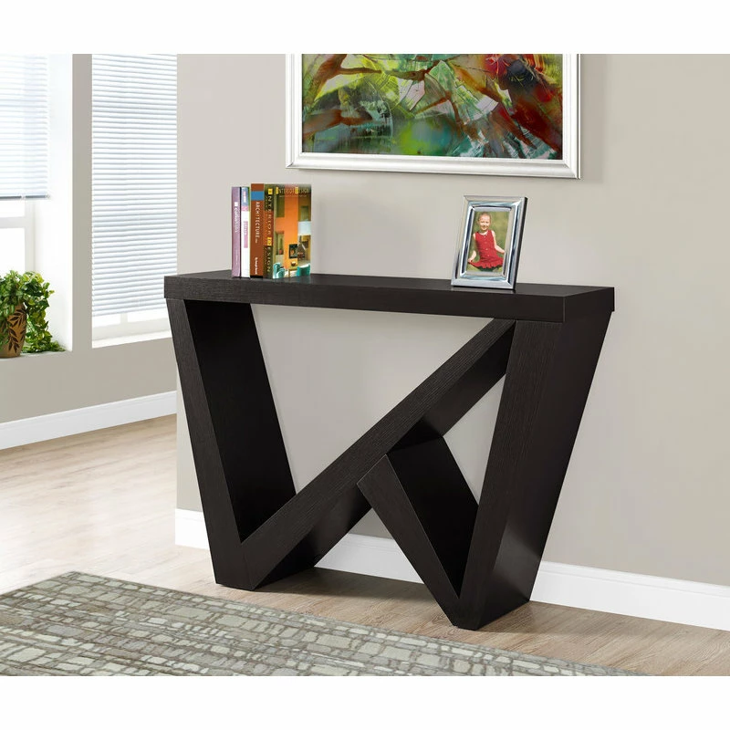 The Accent Table is a contemporary product with a modern edge. Constructed with a thick panel edge and asymmetrical lines, this table will be quick to make a statement in your living space. Perfect for displaying photos or surface decor, the Accent Table showcases your personality.Assembly Required: YesColor: CappuccinoMaterials: MDF, Particle Board, LaminateDimensions: W 47″ x D 11″ x H 32″