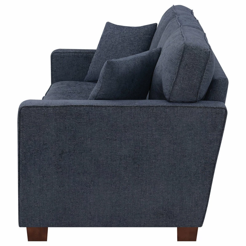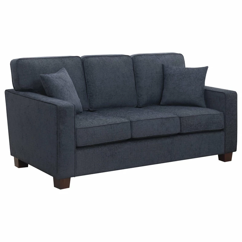 Inviting and cozy, our Russell 3 seater sofa, upholstered in a durable polyester cotton blend fabric is available in a beautiful array of color choices and includes two matching throw pillows. Constructed with solid wood frame, coil spring seats, reversible cushions, and square tapered solid wood legs in a coffee finish. Our 3 seat sofa is meticulously designed for beauty and enduring style, the classic track arm design brings a tailored sophistication to any living space.