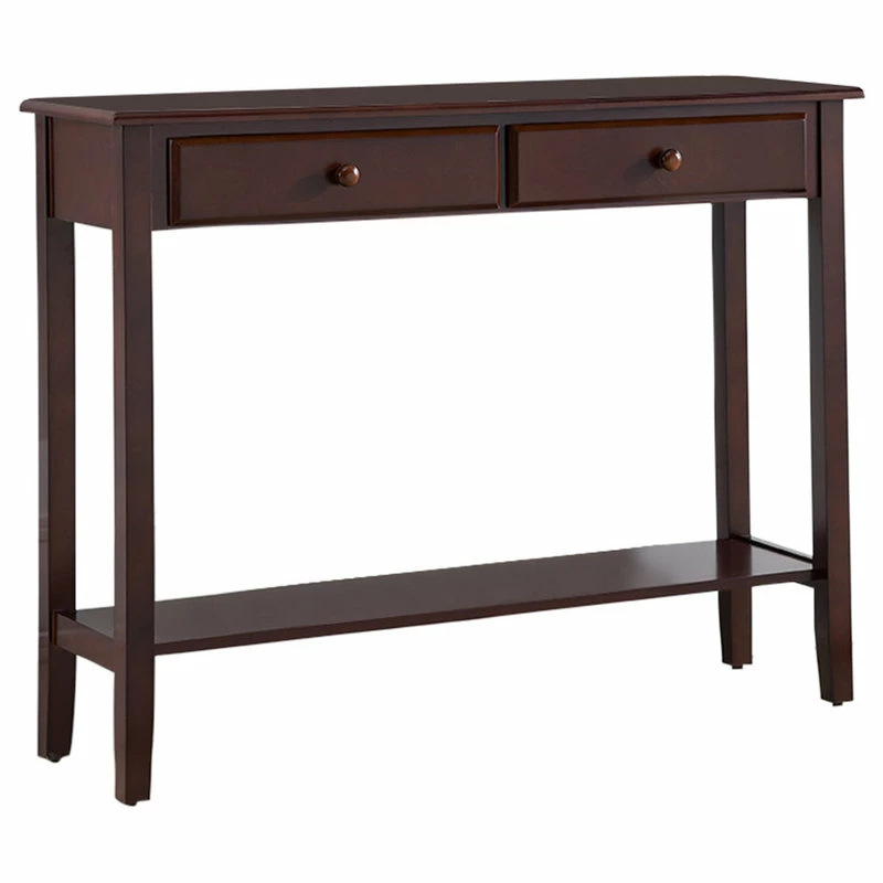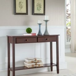 Accent your hallway or living room with the stately Tomag Wood Console Table. This wooden table features a lower storage shelf, two drawerss and a walnut finish.