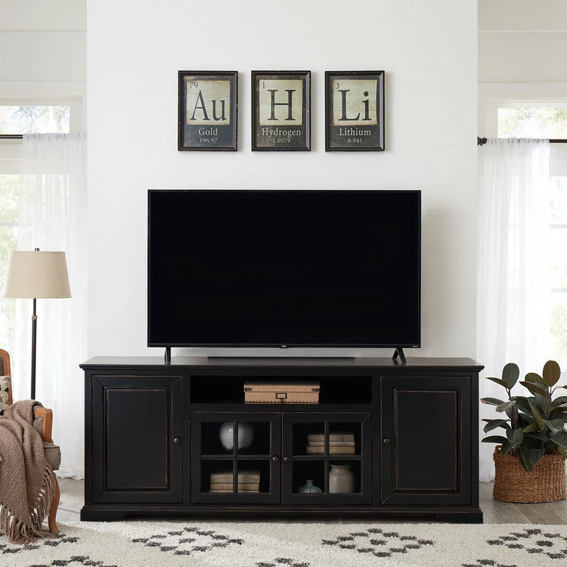 This console offers a nostalgic glimpse of the past with a timeless style and fresh, updated finish all while providing much needed storage and function. Features include a sound bar shelf, under top molding with a bracket foot base, mitered doors with paneled inserts, center glass window pane designed doors, adjustable shelving, cutouts in the back for easily accessible cord management, and graphite finished knob hardware.