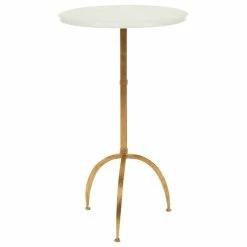 Contemporary and petite, the Myrna accent table offers eye-catching contrast with cool white marble top and antique gold-finish base with three gently curved legs. Care Instructions: Blot up spills immediately, use coasters on table tops under beverages. Use trivets or mats under hot dishes or cookware. Clean with warm water and dry surface immediately after cleaning. Do not use cleaners that contain acid such as bathroom cleaners, grout cleaner, and tile cleaners. Do not use abrasive cleaners in either dry or liquid forms. Use a cleaner and polish formulated for marble surfaces.