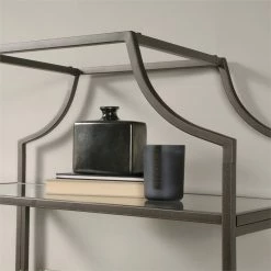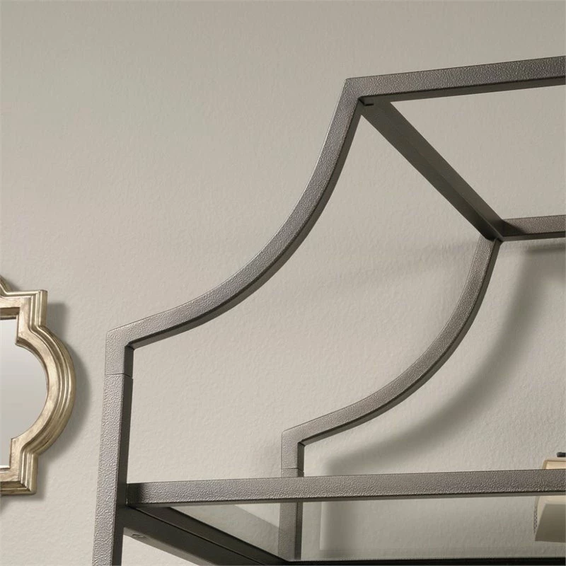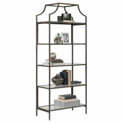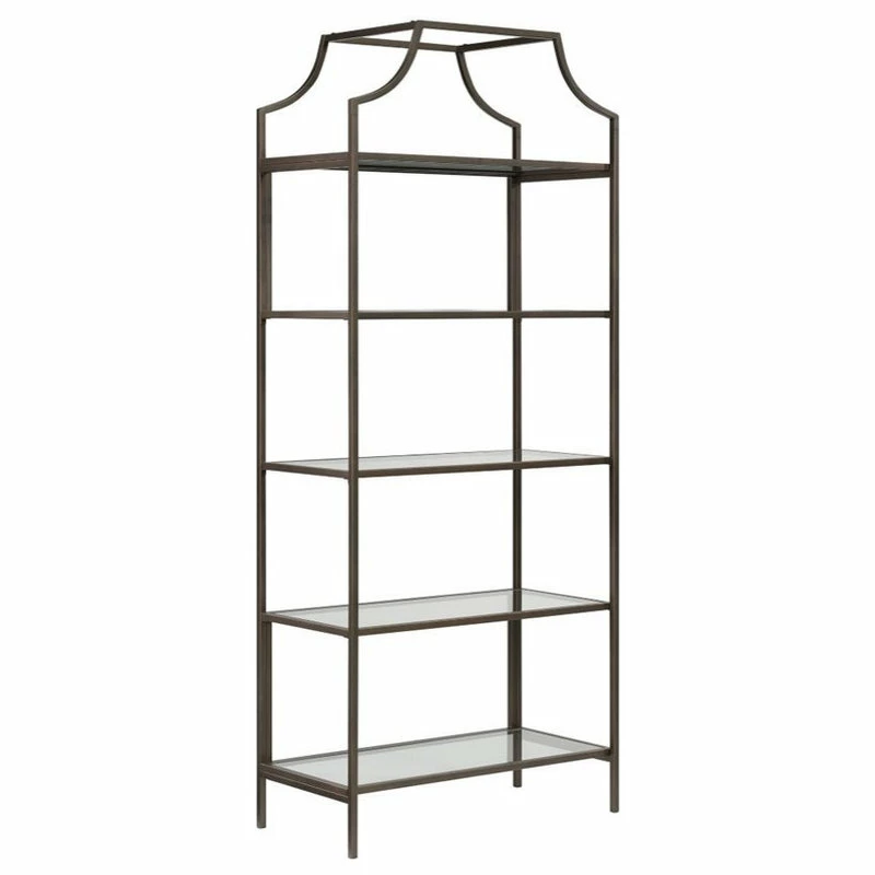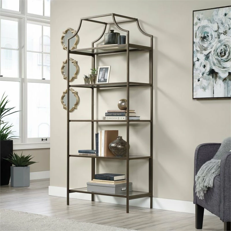 Out with the old and in with the new. Create a beautiful focal point in your home when you add the elegant style and modern design of this bookcase from the International Lux collection. This tall bookcase includes five open shelves for storage and display. Each shelf features safety-tempered glass for an extra touch of luxury that is sure to stand out. The spacious shelves are ideal for highlighting all your favorite home dΓ©cor like decorative plants, your array of knick-knacks, and framed photos of your loved ones. These large shelves also make a great spot to store items like books, stacks of magazines, and organizing bins. Its rounded edges and curved indent design give it a stunningly unique appearance that is sure to grab the attention of your friends and family. Constructed from sturdy metal and finished in bronze, this beautiful bookcase will have your home looking stylish and chic.
