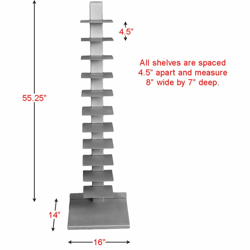 Use this unique bookshelf as an artistic focal point in your room. The tall slender design saves space and adds function. Extremely versatile, this tower shelf can work as a towel stand in the bathroom, bookcase in the bedroom, or even a media stand next to the TV. The 11 shelves are constructed of solid metal with a powder coated silver finish ensuring that no matter where you choose to use it, this shelf will always look as good as the day you bought it.