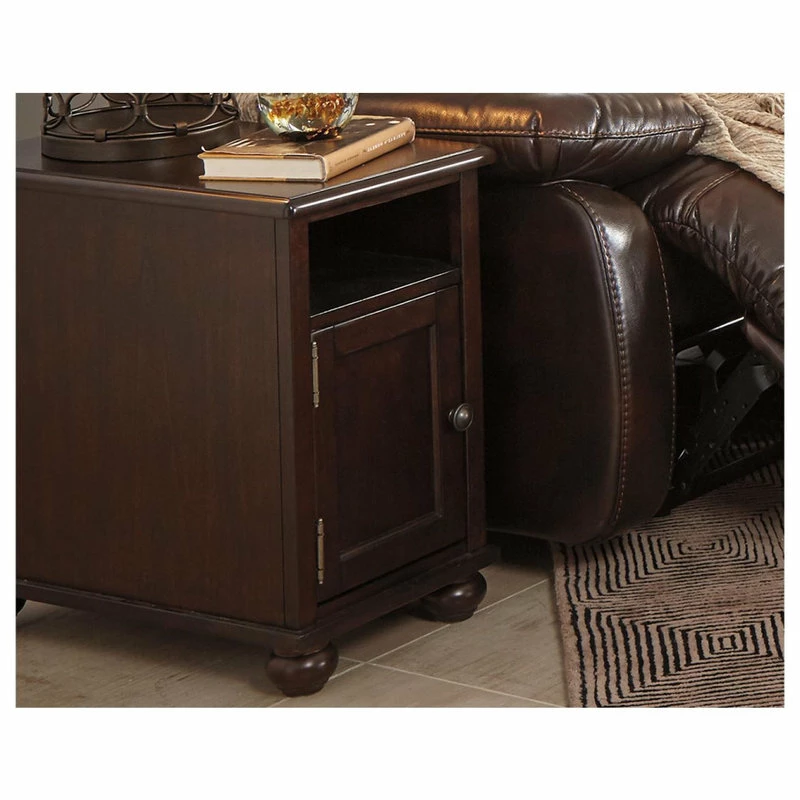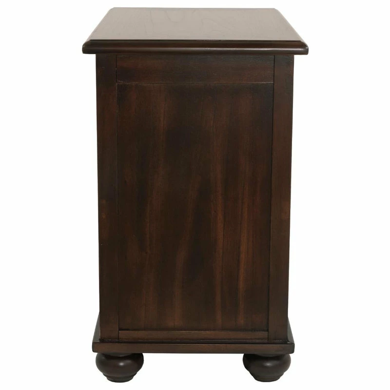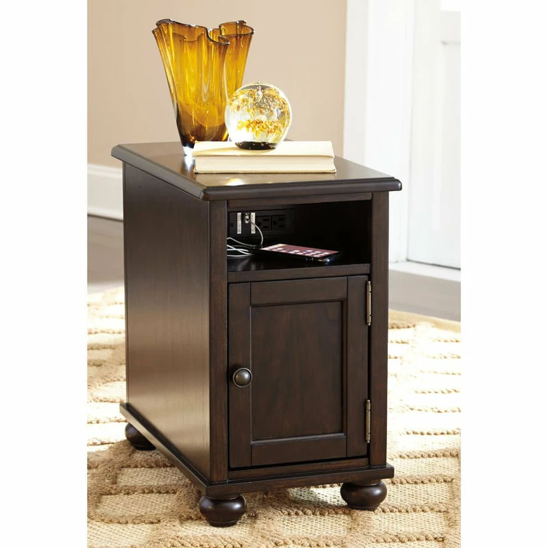 Everything’s within reach with the compact Barilanni chairside end table. You won’t have to leave a seat to charge electronic devices since this stylish companion has two handy built-in USB charging ports, two AC outlets, an open storage cubby and a lower cabinet�perfect for tucking away all your chairside necessities. Its attractive design with smooth dark brown finish is accented with bronze-tone hardware and bun feet for a casual look.
