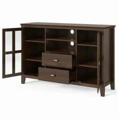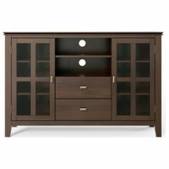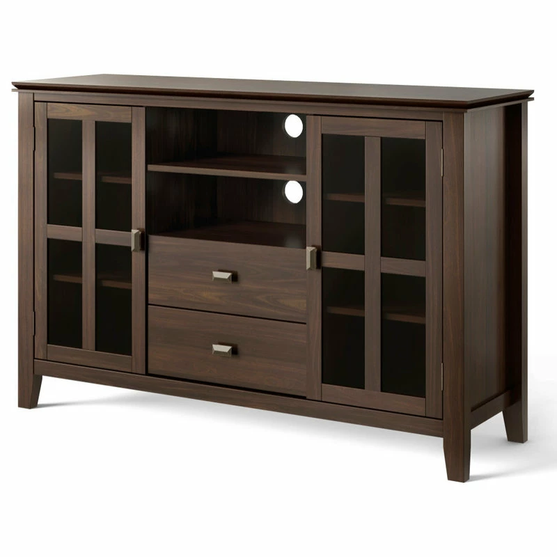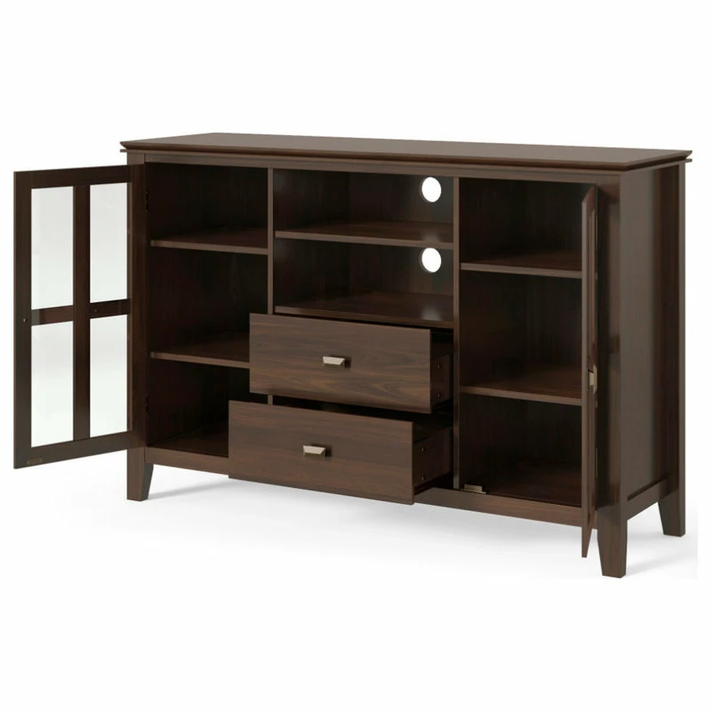 You just bought the ultimate large flat screen TV. Now what to do? Hang it on the wall? No, you need the perfect TV Stand for storage and to enhance your viewing pleasure. Look no further than our most popular Artisan TV Stand. It is perfectly sized for TVs up to 60 inches. The 35 inch height puts the TV at a level that is ideal for comfortable viewing. The Artisan TV Stand has plenty of storage and space for all your media and gaming devices. It has a large centrally located open area with one adjustable shelf and two drawers. The two large side storage cabinets open to two adjustable shelves. The unit features cord management cut-outs for easy installation of TV and media components.