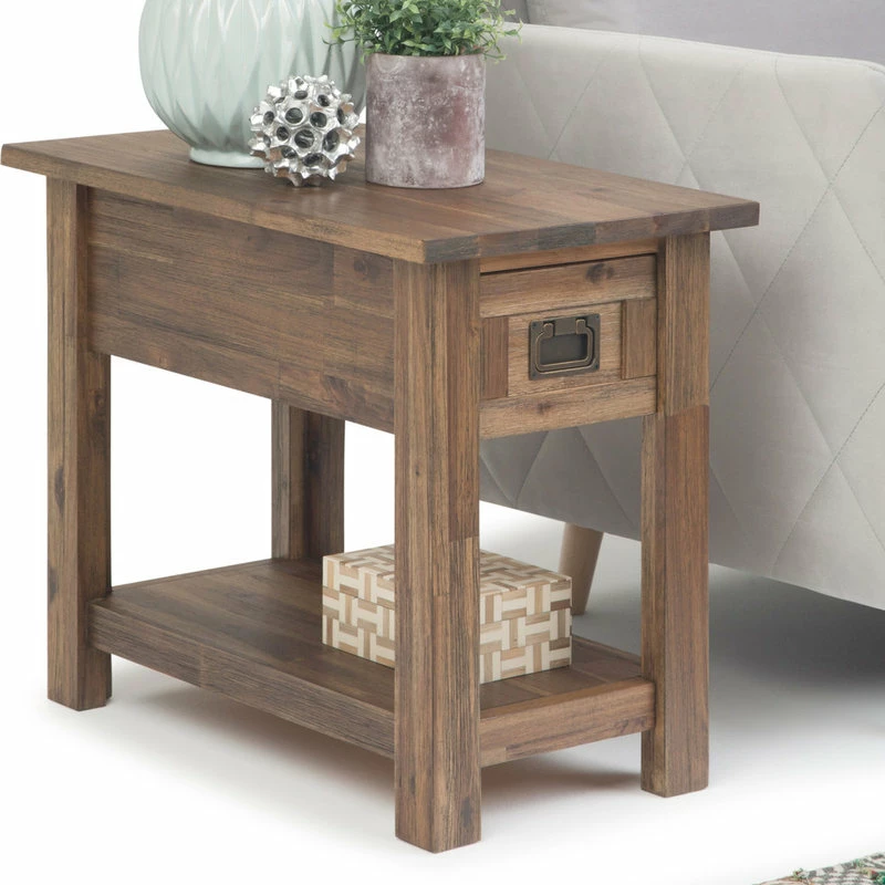 Pair your sofa, accent chair or bed with the rustic contemporary Monroe Narrow Side Table. It features a single drawer and open bottom, perfect for storing and displaying treasured mementos. This striking table is made from beautiful and distinct Acacia solid wood. With its clean lines, shaker style paneling and Antique Brass pulls, the Monroe Narrow Side Table will enhance your room decor. The Monroe collection includes a matching coffee table.