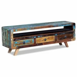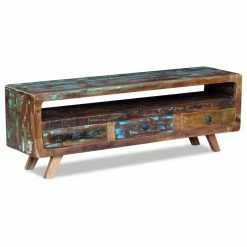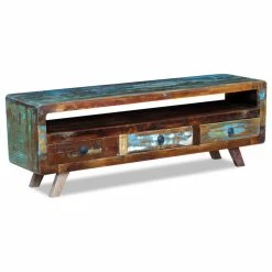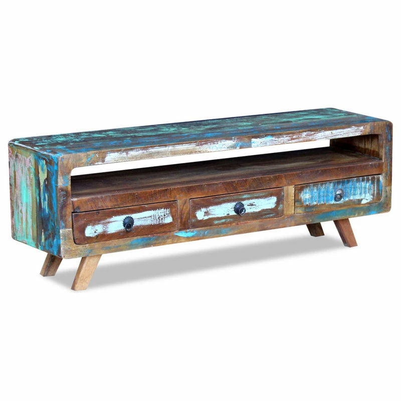 This stylish antique-style wooden TV cabinet is very practical and has plenty of storage space thanks to the spacious drawers and shelf. With its unique appearance, it will make a great addition to your living room or bedroom. The table can also be used as a sideboard, lowboard, side cabinet, and a drawer cabinet, etc. This TV cabinet is made from solid reclaimed wood, which means that every piece of furniture is unique and slightly different from the next. Furniture made from reclaimed wood has the characteristics of different woods like teak, mango wood and acacia. Reclaimed wood is solid, stable, durable, and beautiful. Signs of wear and visible grain structure give each piece its own history and a unique look. The TV cabinet is fully handmade, and the craftsmanship adds to its spectacular retro style. Every step of the process is carried out with the greatest care, be it recombining, polishing, painting or waxing. Important note: colors vary from piece to piece, making each of our side tables unique. The delivery is random.