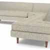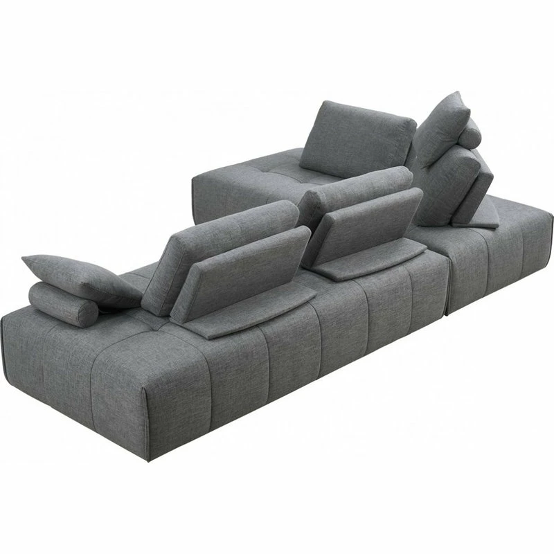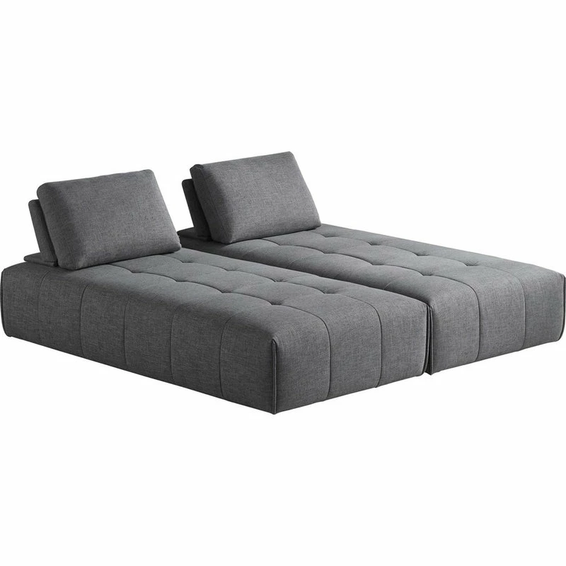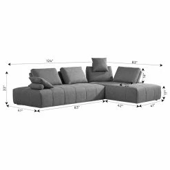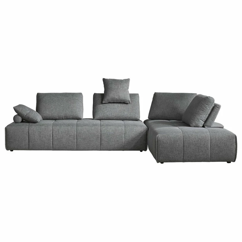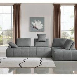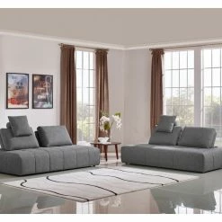 Use your creative spirit to configure this sectional to fit your needs and unique space. Two-piece modular sectional sofa set with square-tufted tight seat and movable backrests in gray fabric. Backrests are boxed waterfall design. Includes two bolster and knife edge pillow combinations that can be used as headrests. Four wood legs in medium brown color on each section.
