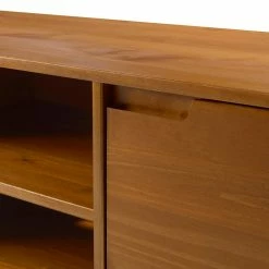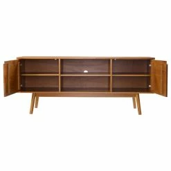 Gather your family around to watch your favorite throwbacks around this mid century modern TV stand. Cutout handles offer easy opening of the two doors with adjustable soft close hinges and provide a simple, modern aesthetic to your living room. Tapered angled legs enhance the entertainment console’s retro vibes. Make movie nights easier with media components on the two adjustable shelves or the center open fixed shelf. You’ll love the solid pine wood build because of its long-lasting quality.
