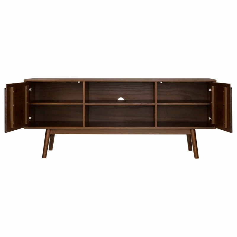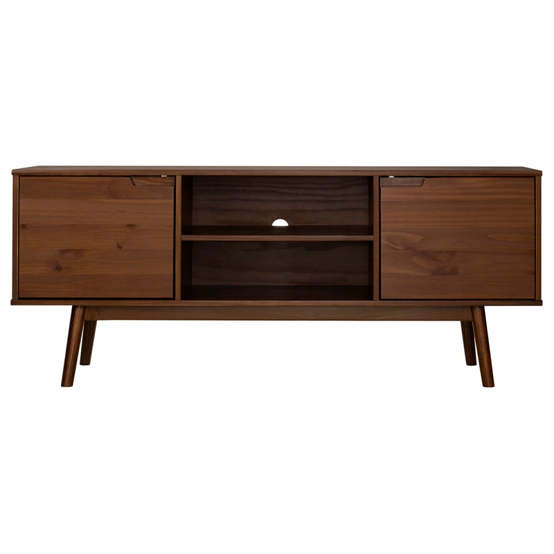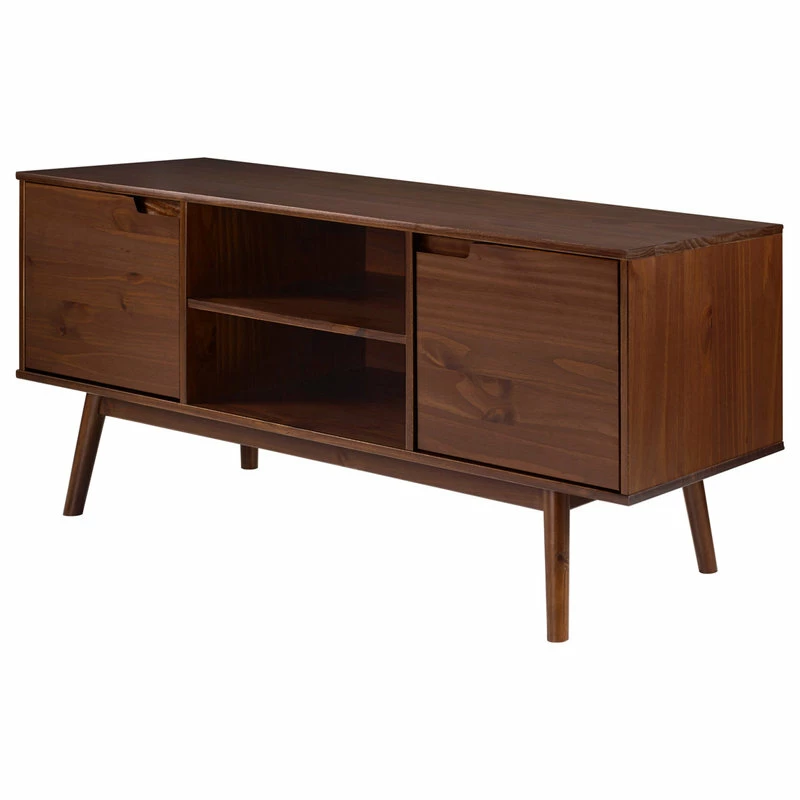 Gather your family around to watch your favorite throwbacks around this mid century modern TV stand. Cutout handles offer easy opening of the two doors with adjustable soft close hinges and provide a simple, modern aesthetic to your living room. Tapered angled legs enhance the entertainment console’s retro vibes. Make movie nights easier with media components on the two adjustable shelves or the center open fixed shelf. You’ll love the solid pine wood build because of its long-lasting quality.