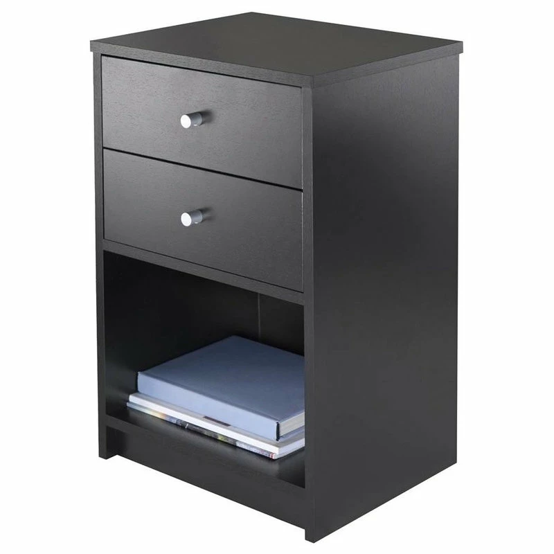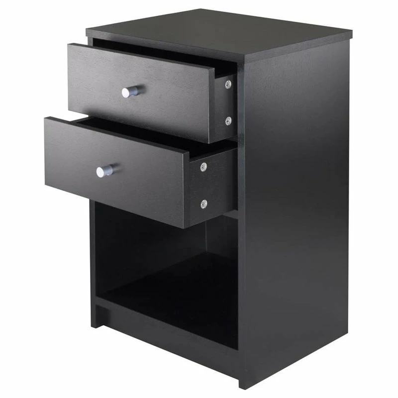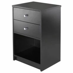 The Winsome Wood Ava 2-Drawer Accent Table brings together the clean lines of contemporary styling and a clean black finish to provide a timeless look that will blend with any decor. With two roomy drawers and an open shelf, the table offers ample storage. Place it next to your seating in the living room or den to keep remotes and electronic devices within easy reach. Or use it in the bedroom with a table lamp for reading, keeping books and magazine neatly tucked away. Constructed of sturdy composite wood, the unit also makes an ideal addition to a home office where it can serve as a printer stand with paper storage on the lower open shelf and office accessories in the drawers. Simple yet attractive metal knobs with a satin finish add a touch of modern to the stand. For larger beds, sofas or rooms, try adding one accent table on each end to unify the space (each sold separately). Conveniently packed and shipped in 1 box that includes the hardware necessary for assembling. Replacement parts can be requested directly to the manufacturer within 60 days from date of purchase.
